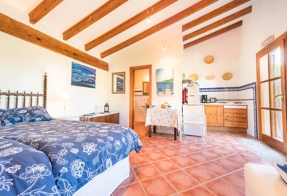 Il dispose d'un salon, d'une chambre avec un lit double (180x200) et de grands placards. Il est équipé d'une cuisine complète et salle de bain privée. Il dispose d'une terrasse meublée, très spacieuse au pied du jardin ou au premier étage et avec vue sur la montagne.